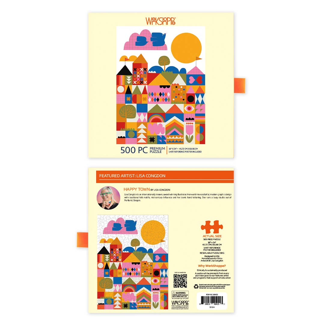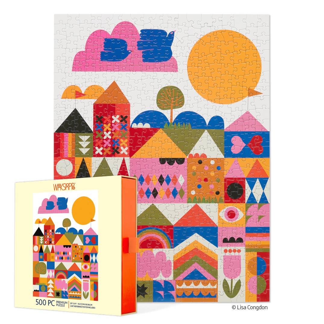 Bright colors and fun shapes make up this 500-piece graphical town puzzle by Lisa Congdon. The bold, primary colors are a testament to a Scandinavian, mid century simplicity. Ages 13 and up.
