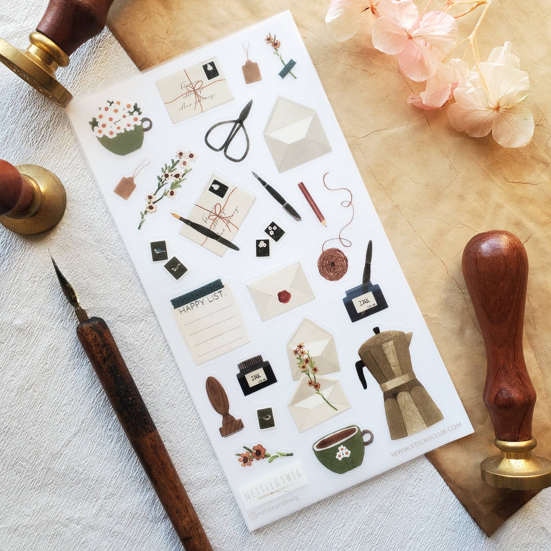 Whether you're a dedicated pen pal or simply love sending and receiving happy mail, you'll adore @nettleandtwig's charming sheet that celebrates the art of letter writing. With its delightful illustrations of letters, stamps, pens, and essential supplies, this sheet beautifully captures the timeless magic of snail mail.