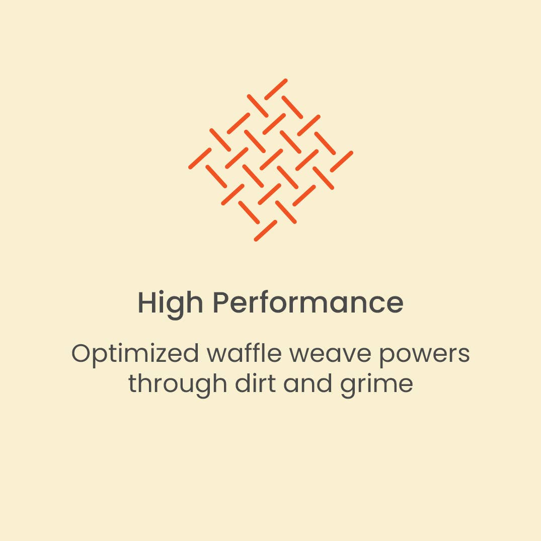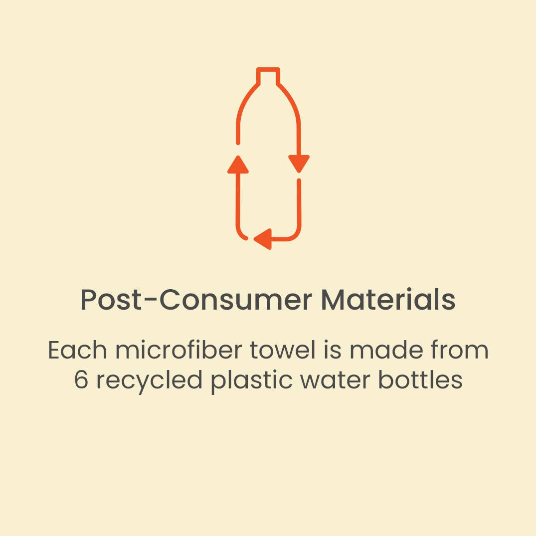 Optimized microfiber material blend. Made from 6 recycled plastic water bottles. Ultra absorbent and fast drying. 3x more absorbent than cotton and dries 5x faster. High performance waffle weave. Powers through dirt and grime.