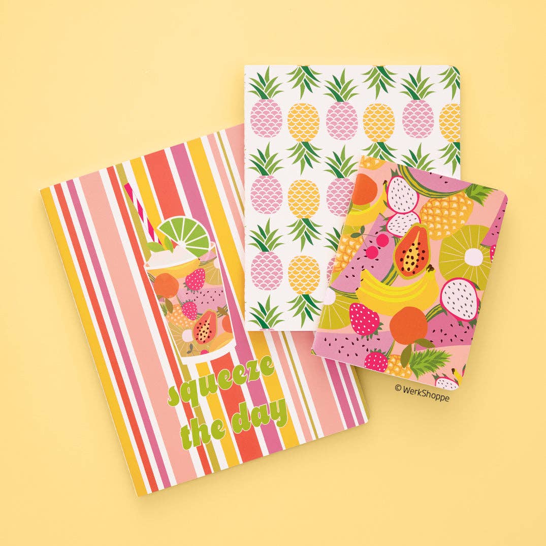 Keep track of goals, class notes or work to-do lists with this set of three coordinating stitched notebooks. With a sweet and fruity design, and graduating in size, this set makes it easy to get inspired.